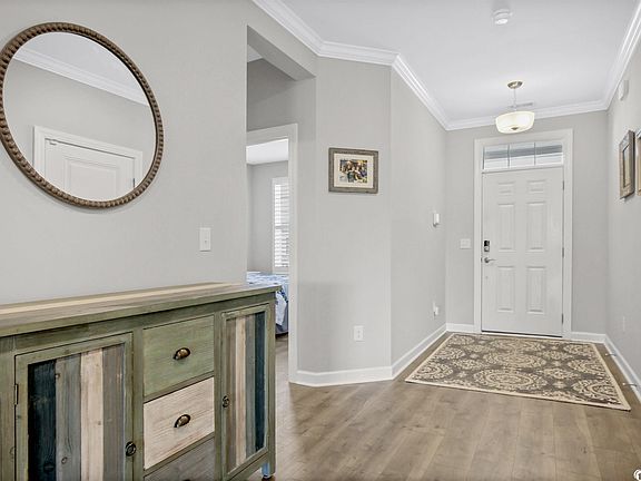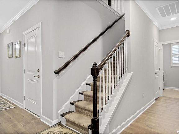 This stunning home is ready now for move in and only a year old! No waiting for building permits, materials, or construction! Waterfront 3 BR/3 BA home in the Waterside neighborhood of the highly sought after Bridgewater community. This home is in pristine condition and the sellers have meticulously chosen many upgrades that were not part of the original standard floor plan: luxury vinyl flooring throughout the first floor; gas fireplace in living room, along with gas to the outdoors; and gourmet kitchen with staggered white cabinets and quartz countertops, beveled subway tile backsplash, double ovens, coffee bar, stainless appliances, and gas cooktop. Other amenities include an open floor plan with an abundance of light from the many windows; large ground floor primary bedroom with double sinks and spacious walk in shower along with a huge walk in closet; downstairs guest bedroom; separate full bath; flex room/study/possible 4th bedroom; drop zone; and laundry room. Upstairs boasts a third bedroom; full bath; recreational/living area; exterior porch; and an enormous walk-in storage area, which is a huge plus and an uncommon feature. The 24x10 extended rear screened porch (also an upgrade) overlooking the lake is definitely one of the highlights of this home! There are custom plantation shutters in place throughout, a sprinkler system, an alarm system, and the list goes on and on. The Bridgewater community offers an active lifestyle, including community pool, grilling area, fitness facility, clubhouse, pickle ball, exercise classes, get-togethers and more! There is a calendar of events every month! Located across the street from Seacoast hospital and medical facilities, Bridgewater is convenient to dining, shopping, entertainment, golf, fishing, marinas, and is just 10 minutes to the sandy beaches of the great Atlantic Ocean! Make your appointment today! Measurements are approximate and not guaranteed. Buyer is responsible for verification.