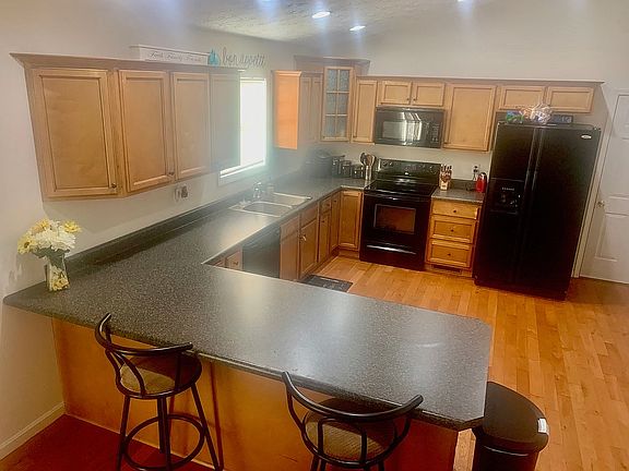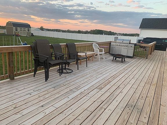 Beautiful ranch style home on 3/4 acre lot overlooking open fields. Freshly landscaped yard with new lofted storage building in rear. Large double car garage with a workbench, two peg boards, fridge and shelving. This spacious floor plan includes three bedrooms and two full bathrooms and one half bath with real hardwood flooring throughout the entire home. Fresh paint throughout the entire home to include the ceiling. The updated large rear deck would be great for entertaining. Home features include: crown moldings, vaulted ceilings in main areas, window coverings, and updated light fixtures. Oversized kitchen and pantry shows off accented wood cabinetry ;which includes, refrigerator, dishwasher, and a glass top range with overhead microwave. Home is a must see for anyone looking to move into a turn key residence.