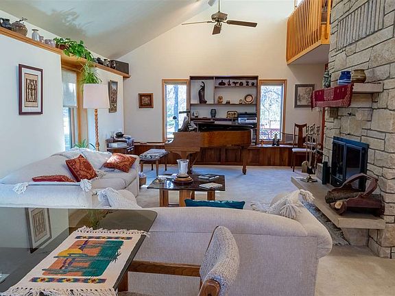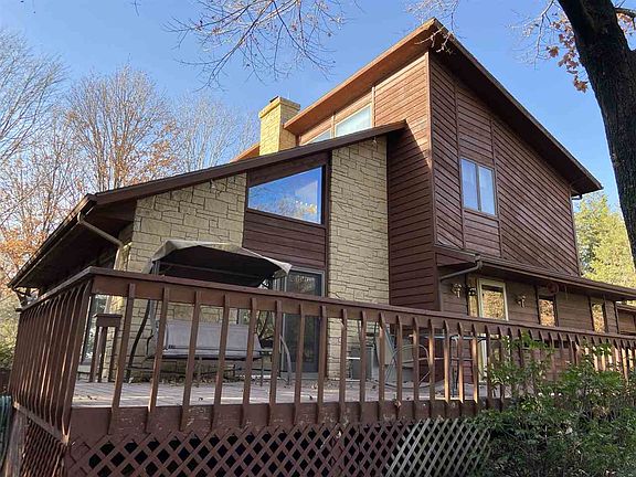 Surrounded by well established trees, this lovely contemporary, energy efficient home is tucked away up a cedar lined driveway. Kansas limestone and redwood exterior, large front and back decks and patio set this house apart. The limestone fireplace and cathedral ceilings in the main floor great room extend to the overlooking upper level with its large bedroom, closets, bath and sitting room. Windows to all four directions give warmth and light in winter and are shaded by design and motorized blinds for summer. The kitchen has an open feel with a built in table and baking center and spacious countertops and oak cupboards. The main floor bedroom has a walk in closet and bath with linen closet. A guest closet, utility room with panty and office nock add to main floor accessibility and convenience. Two large bedrooms with closets and storage space, bath, large rec room and walk-in closet spanning the length of the rec room make the finished basement ideal for teens, family and guests. A shop area and storage space add to the two car garage. This home is set on 1.2 acres with a large front yard and back yard that looks out at a wooded area. Hiking trails around the nearby creek connect with neighboring areas. Just off US Highway 50 with easy access to Interstate 135 puts you within 5 minutes of shopping, the YMCA, Newton Medical Center and other essential services. Whether you enjoy an active lifestyle or prefer a more quiet, leisurely pace, this home provides the perfect setting for you. Co-listing Kansas agent is related to seller. This unique home is for you. Special Features Included: passive solar, energy efficient; cathedral ceilings; redwood siding stained 2018; limestone exterior and fireplace--self contained Cozy Heat, chimney cleaned 2019; foyer with tile and wood floors; kitchen with built-in table, oak cabinets, stove, refrigerator, disposal, dishwasher--purchased 2018; microwave, tile floor; basement: sump pump with backup (new 2019), water heater, water softener; 5 ceiling fans; window coverings; sound wiring; heat lamps in all bathrooms; exterior: lightning rod protection. Not included: attached walnut cabinets in great room; oak entry peg board, some perennials. Co-listing Kansas agent is related to seller.