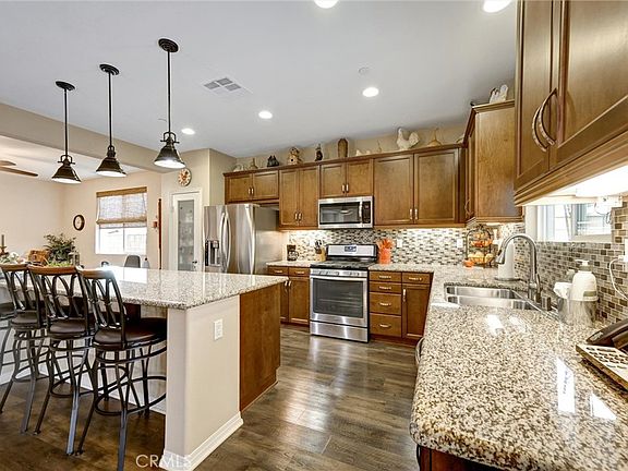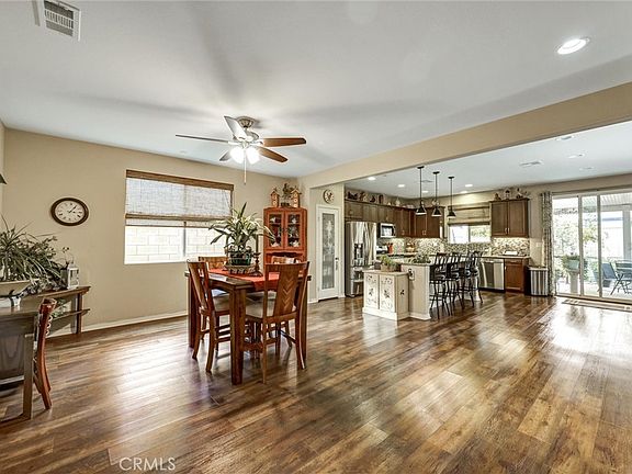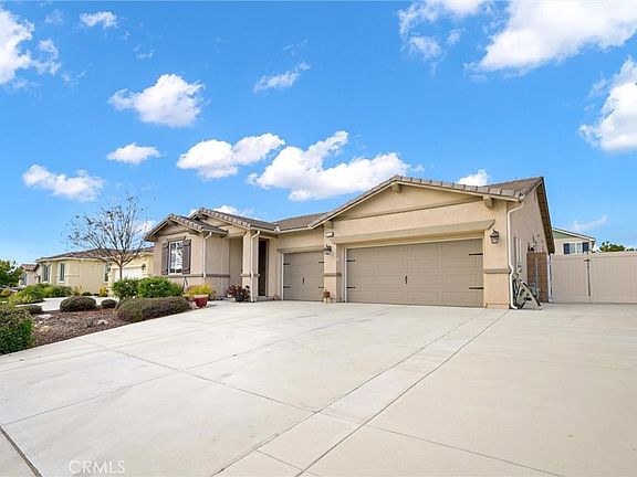 Attention New Home Buyers. Great Value in this Newer (2017 Built) Home with Many Upgrades and Features that would cost you Thousands of Dollars in Builder Upgrades when compared to buying a new-build in nearby home developments. This highly desirable Single-Story Home sits on a Large 9500 sf Lot WITH GATED RV PARKING; Large 3-Car Garage & Extra-Wide Driveway. It is Fully Landscaped with Low Maintenance Yards. The interior of the home is dressed in Luxury Vinyl Plank Flooring throughout the entire house! And boasts a very spacious, Open Floorplan with a Great Room set-up, and separate sleeping quarters at each end of the house. The Private Primary Bedroom and En-suite Bath with a Huge Walk-in Closet located to the rear of the house, while the other two bedrooms and guest bath are located at the front of the house. The well-appointed Great Room is the heart of the home with a large kitchen and huge island with counter seating for four, which is the focal point, along with a massive dining room (which could be walled off and possibly converted to a 4th Bedroom) and a spacious family room. Easy flow into the back yard which features a patio that spans the entire width of the house, accented by a FULL LENGTH Alumawood Patio Cover with Ceiling Fans. Easy care, fully landscaped yard with fruit trees and vegetable gardens, plus a large Garden/Storage Shed leading to the HUGE Gated RV Parking area with concrete pad that runs the full length of the house on the Garage side. ALL APPLIANCES are Included, as well as the ceiling fans in every room, and the large storage shed in the back yard, too! Located within the Heritage Ranch neighborhood in the Franch Valley Area, near the new French Valley Library, shopping and dining centers, as well as close proximity to outdoor sports, boating, fishing, hiking, and biking trails and lakes. Just a short drive to Temecula Wine Country, and easy commuting down Winchester Rd/Hwy 79 to the 15 & 215 Freeways, or the other direction towards Idyllwild and Cabazon/Palm Springs. Move-in Ready! VA & FHA Offers Welcomed!