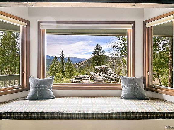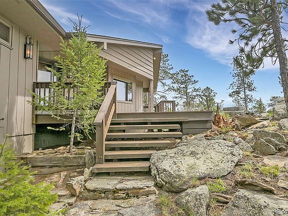 Welcome to this charming mountain home located in the heart of Evergreen on two stunning, private acres with mountain/valley views! This ranch style home is a one-of-a-kind bursting with character. The open concept is ahead of its time with a floor plan perfect for entertaining. Remodeled in 2011, the home contains tongue & groove beamed ceilings, huge picture windows, hardwood floors, and a huge brick fireplace with a cozy wood burning stove. The kitchen has granite counters, solid wood cabinetry, stainless appliances, pantry and a brick wall fireplace open to the breakfast nook & dining area. The main level offers a Primary en-suite, and 2 additional bedrooms sharing a Jack & Jill bath. Convenient access from the dining room to the two-tiered decks perfect for watching the local wildlife migrate by. The over-sized lower level garage has a private entrance to a quiet office or workshop space with additional storage and built ins. There is a separate 2 car detached garage. The under house storage areas are huge. Minutes to schools, shopping, open space and I-70. Huge parking area!
