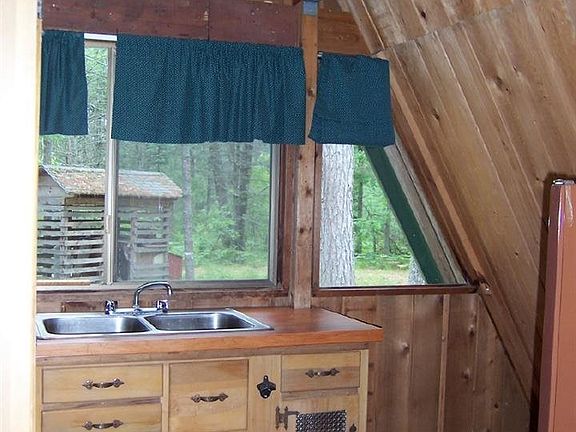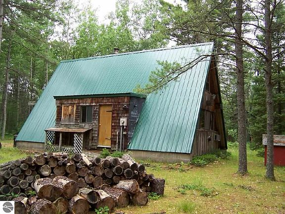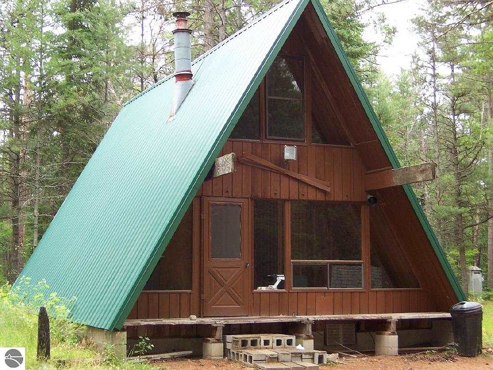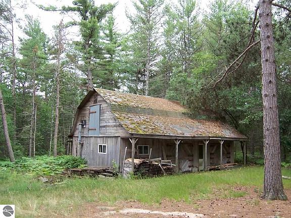 Beautiful wooded 4.59 acre parcel near Luzerne with large barn-style garage/workshop and 3 bedroom A-frame style cabin. Large pines and hardwoods mixed. Cabin is nicely secluded from the roadway.