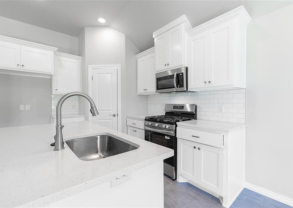 This Tero floor plan includes 1,680 Sq Ft of total living space, which includes 1,565 Sq Ft of indoor living space and 115 Sq Ft of outdoor living space. There's also a 385 Sq Ft, 2-car garage with a storm shelter installed. This affordable home offers 4 bedrooms, 2 full baths, covered patios, and a utility room. The great room welcomes large windows, wood-look tile, a ceiling fan, and Cat6 wiring. The charming kitchen has 3 CM countertops, stainless-steel appliances, wood-look tile, well-crafted cabinets with decorative hardware, a center island, and stylish tile backsplash. The primary suite is straight ahead and supports carpet flooring, a ceiling fan, and the perfect sized windows. The attached primary bath suits a dual sink vanity with an elegant countertop selection, a walk-in shower, an elongated water saving toilet, and a HUGE walk-in closet! The outdoor living section is covered and has fully sodded yards with smart home irrigation control. Other amenities include a tankless water heater, a fresh air intake system, and MORE!