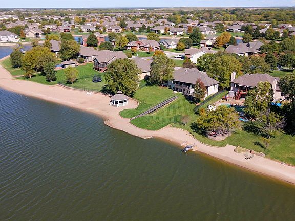 Extraordinary opportunity to live in a contemporary home on a boating lake with no special taxes! This 5 bedroom 4 bath home in Maize School District has been renovated inside out starting w/ all new concrete siding, fresh exterior paint, cedar detailing on the front facade & an iron door that sets the tone for the entire home. Step inside to find an entirely open floor plan, soaring ceilings, windows galore letting in light at every angle, warm white walls and new scratch-proof luxury plank flooring. Ridge Port neighborhood is situated on a 40 area boating/skiing/fishing lake with over a mile of sandy beaches and the whole back of this home features windows accentuating the scenic backyard, lake views and beach access. This quarter-acre lot uniquely features a 40’ bridge, a gazebo just waiting to host beach parties and 90’ of sandy beach. Unlike other boating lakes you are able to pull your jet-ski right up on the beach. The custom designed kitchen features modern black slab soft-close cabinetry with dual appliance garages, champagne faucet and hardware and quartz counter tops. The oversized quartz island with waterfall edge was made for entertaining & features additional storage, bar seating and designer drum pendants lights above. Brand new, top of the line appliances which includes dishwasher, double ovens, an air fryer feature and a built in kitchen aid microwave. The hidden walk in butlers pantry is white oak slab cabinets that include a pull out trash & recycle cabinet, drawers galore, ample counter space ideal for food prep while keeping the clean clean and a black matte pot-filler for making your morning coffee. The entryway from the 3 car garage includes a large walk-in coat closet, a guest bath with zellige tiles and an oversized laundry room featuring terrazzo floor tiles and plenty of room to add a pet zone or hobby area. You’ll love the lake views from the huge master bedroom and exterior door to multilevel deck which has a built in 220 ~ an ideal spot for a hot tub. The newly designed Master bath boasts a white oak double vanity with built in outlets to keep cords tidy & out of sight, a stand alone bath tub and walk in tiled shower. Fixed glass shower panel will be added before closing. The full finished walk out basement includes a walk-up bar with concrete flooring, white oak slab cabinetry, leathered black granite counter top and beverage center. Plus the 4th bathroom and 3 additional bedrooms. The home now has brand new flooring throughout, new interior paint, lighting from Accent interiors, plumbing fixtures, cabinetry, new trim, doors and hardware. The living room and family room have In-Wall Flat Screen TV Power and Cable Concealment Kits. Shower glass & new garage door glass has been ordered. 3133 Ridge Port Cir is conveniently located directly across the street from the neighborhood park and pool and just 2 miles from both New Market Square full of dining & shopping options and from HWY 96 to get you anywhere in town quickly. The homes hot water tank & manifold systems & HVAC are all 5 yrs old, the siding is 3 yrs old & the roof is 7.