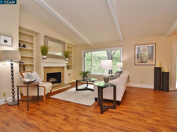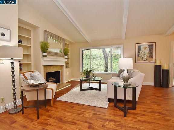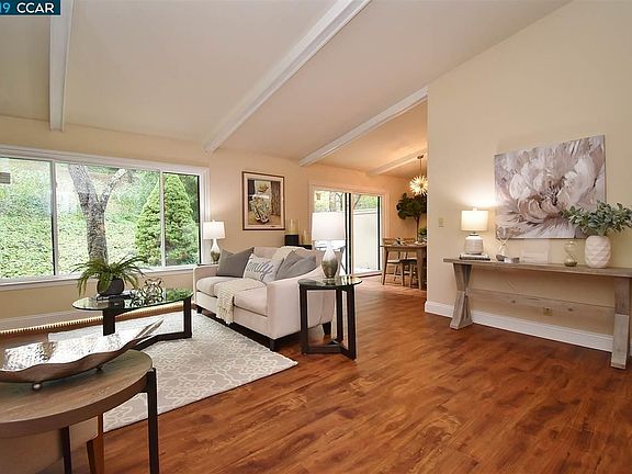 Open House Sunday, February 24, 1-4 p.m. LEVEL-IN porch entry. 2 BEDROOMS + DEN, 2 BATHS. Attached carport. Smooth vaulted ceilings. White Open Beams and Fireplace Mantle over luxurious tiled hearth with built-in surround cabinetry and display for your ultimate entertainment center. NEW hard-surface flooring. NEW dual pane windows throughout. Expansive privacy patio and picture window views of lawn, hillside trees, and corner redwood grove. Remodeled kitchen, stainless steel appliances including built-in Microwave. Large skylight in both bathrooms. Remodeled Master Bath and Hall Bath. Master bedroom with slider access to exclusive private patio. Gas fireplace and furnace.
