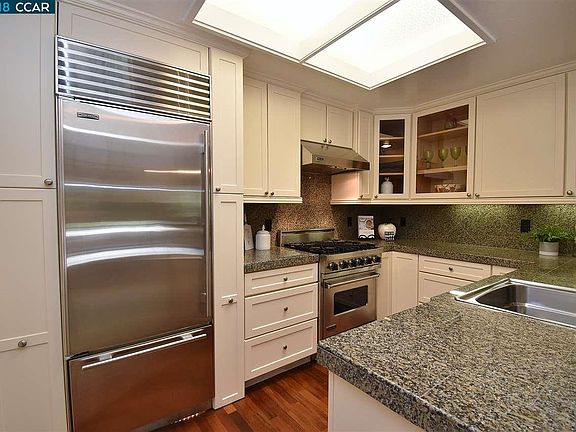 2 BEDROOMS + DEN. Covered parking at your doorstep for 2 cars and a fully level-in porch entry. Smooth vaulted ceilings, satin crown moulding, almond walls, eggshell wainscot, contributing to shimmering MERBAU HARDWOOD FLOORS THROUGHOUT. Filtered sunlit views of lawn and hillside trees from louver encapsulated PELLA picture windows. PELLA slider opens onto an expansive slate-tiled patio with cedarwood fence enclosure. Ebony marble gas fireplace and hearth surrounded by white cabinetry and display cases for a full entertainment center. Exquisite "Toupin" 2004 remodel kitchen features Kraftmaid cabinets, tiled granite counters, Viking gas stove, and built-in Sub-Zero refrigerator. Skylights in kitchen and baths. French doors open into LR study. Master bath with Wasauna water & air massage jetted tub, Toto Washlet toilet. Guest bath with Carrera marble vanity and shower enclosure. Master bedroom overlooks red tiled patio with lush shrubbery. Guest bedroom with Murphy bed.