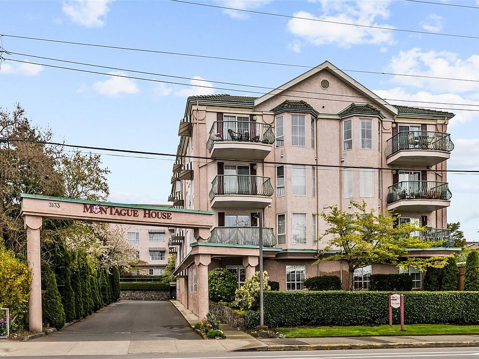 Welcome to Montague House! This top floor, southwest-facing suite is bathed in natural light, creating a bright and welcoming living space. Freshly painted, this spacious 2 bedroom layout features an open concept design, perfect for comfortable living and entertaining friends and family. Located in a well-maintained 55+ building, you'll enjoy access to fantastic amenities, including a social room, exercise area, and a rentable guest suite. Conveniently situated near trails along the Gorge, parks, shopping, banks, the library, coffee shops, and groceries, with transportation right at your doorstep. The building offers covered visitor parking, additional storage, and is well managed, with a waitlist for resident parking. One small furry friend (up to 25 lbs) is welcome. This is an ideal choice for downsizing or retirement, combining comfort and convenience in this exceptional community! PRICED REMARKABLY WELL FOR A PROMPT SALE!