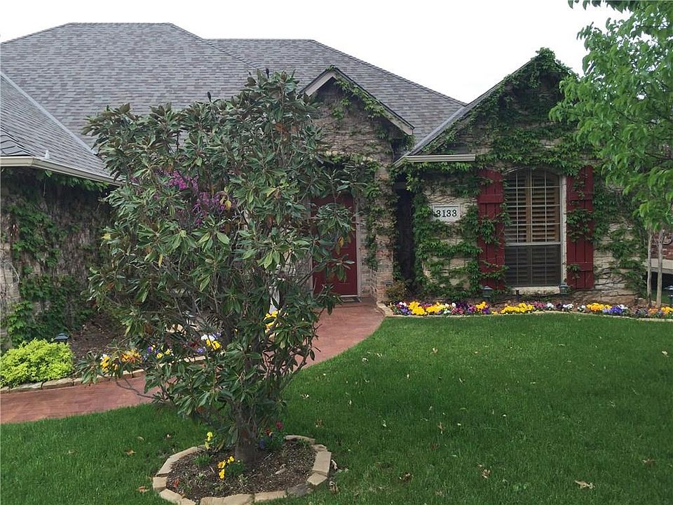 BACKYARD OASIS in "The Villas II at Coffee Creek." This lovey property backs to community commons, offering picturesque views of mature trees and Mother nature! A true 4 bed (4th bed used as office), 3 full baths, and a 3 car garage. Spacious open areas with high ceilings make for great space to entertain. Living area has a stunning brick fireplace and large windows for perfect views of the greenbelt area. All bedrooms are spacious with plenty of closet space. Beautiful warm hardwood floors in living, dining and study areas. Inground storm shelter and water softener system.