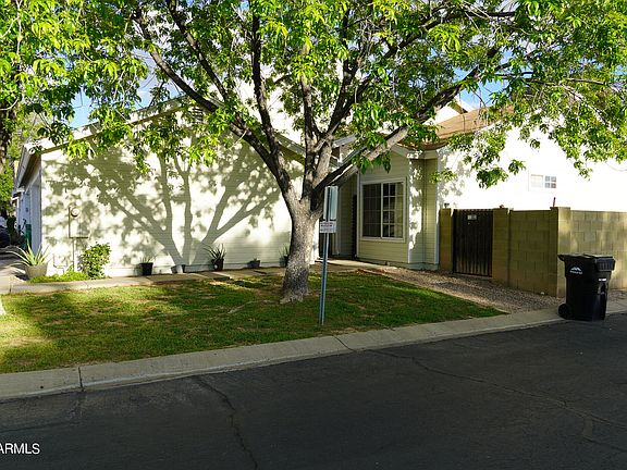 Adorable 2 bedroom single story townhouse with a 2 car garage! End unit, so great L shaped yard with side gate. Front and back yard perfectly shaded with trees for those hot Arizona days. Vaulted ceilings in the living, dining and master bedroom. New AC unit in 2020, new fridge/dish washer/above stove microwave in 2021 and new water heater in 2022. All of the big expenses are taken care of! New exterior paint in March of 2023 as well! Great primary residence or excellent rental income property!