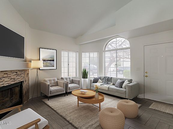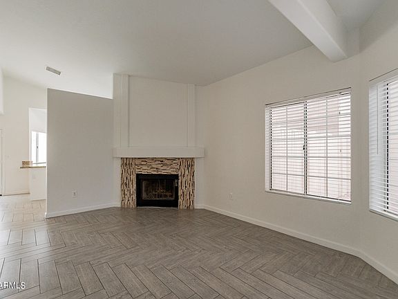 This lovely 3-bedroom, 2-bathroom home is bathed in natural light, creating a cozy and welcoming ambiance. The kitchen has been updated with sleek white shaker cabinets, granite countertops, and stainless-steel appliances, blending functionality with elegance. In the front family room, a fireplace adds charm, while wood-look tile flooring in a herringbone pattern adds character. Plush new carpeting adds comfort to the great room, stairway, and bedrooms. The bathrooms feature granite countertops, white cabinets, with the master bathroom offering double sinks and a tub/shower combination. All new door hardware has been installed throughout. The 2-car garage has epoxy flooring. Beautiful French doors lead to the pool and low-maintenance backyard, ideal for enjoying Arizona summers and hosting guests. The interior has been freshly painted, including the exterior eaves and brick walls, for a clean and refreshed look. Centrally located near shopping, restaurants, the Boeing Company, and the 202 freeway, this home offers a perfect blend of comfort and convenience. Call today to schedule a private tour!
