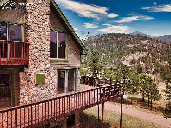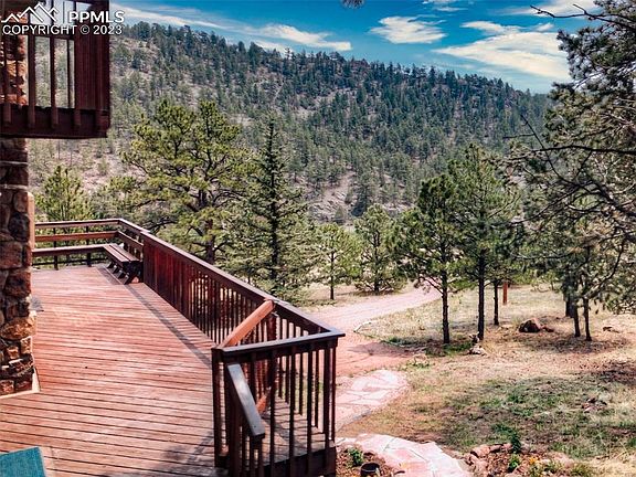 Dramatic canyon walls, a lush valley & Four Mile Creek, filled with trout (for three miles of resident-only fly fishing), showcase this beautiful home. Truly a magical setting, Lakemoor West is a well kept secret - a convenient location but tucked away into a private world of Colorado beauty and serenity. Bordering thousands of acres of public land, this is a combination of level land and rock formations. The cozy mountain lodge is well maintained, with newly refinished rich hardwood floors and new carpet. Redwood wrap around deck offers views in several directions, & stone walkways and patios are filled with plantings. Dramatic two story living room with a woodburning masonry fireplace, plenty of windows for views and natural light. The kitchen has granite countertops, ample cabinetry, breakfast bar, bay window, large pantry, and all appliances and a refrigerator are included. A separate room off the living room functions as a dining room/office/library, has hardwood floors and a bay window overlooking the rocks and a small patio. Main level bedroom, full bath. Upstairs there's a spacious loft area, (an additional sleeping area or study), a bedroom with a balcony, walk-in closet, full bath w/two sinks and a soaking tub. Lower level walk-out, huge family room (or third bedroom) with a fireplace insert, wood floors, another full bath & laundry facilities. Garage/workshop, additional tandem carport. Recent improvements: new roof, high efficiency furnace, hot water heater, disposal, fresh paint, new carpet. This is true Colorado living. The property is convenient to thousands of acres of BLM land, national forest and state land; gold medal trout fishing; hiking, atving, rockhounding, hunting and more. An easy drive to downhill skiing, Colorado Springs, Cripple Creek and Woodland Park, and a great getaway from the Denver area. High speed internet, a treehouse, county maintained roads and an abundance of wildlife are extra bonuses!
