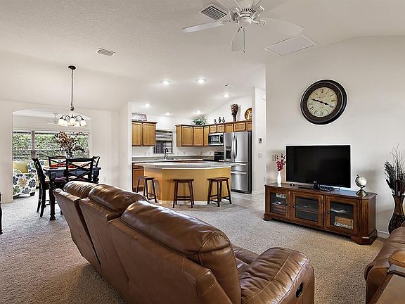 TURNKEY (Furniture & Furnishings Included), Poured Concrete 3/2 Allamanda Designer Home in the desirable & convenient Village of Charlotte. * GREAT LOCATION just minutes to Brownwood Paddock Square, Lake Sumter Landing, Shopping & Dining at Colony Plaza (with Publix) & Sarasota Plaza (with Walmart) not to mention a DOZEN Executive & 4 Championship Golf Courses within an approx. 10-minute golf cart ride! * This home boasts exceptional CURB APPEAL with Professional Landscaping, including low-maintenance Stone Hardscaping, Brick Edging & Custom Landscape Lighting (walkway & uplighting). * Nature lovers will enjoy BOTH a charming Front Porch AND a spacious Screened Lanai with concrete grilling area in back. * The OPEN CONCEPT, Split Floor Plan features VAULTED CEILINGS in the Living/Dining/Kitchen area (NO POPCORN Ceilings!), while the spacious Kitchen showcases a large Center Island with Breakfast Bar, new STAINLESS APPLIANCES & Solid Wood Cabinets with Pull-Outs. * Behind the Dining Room is an approx. 9x14 FLORIDA ROOM perfect for a home office, den or TV room. * The Master Bedroom boasts 2 WALK-IN CLOSETS and En Suite Bathroom with TILED Walk-In Shower, Dual-Sink Vanity & Commode Closet; while Bedrooms 2 & 3 and Bathroom 2 are privately located on the other side of the home, behind a Pocket Door ideal for overnight guests. Both guest bedrooms feature full-sized closets, with an additional Linen Closet in the hallway. Bathroom 2 has a TILED Shower/Tub Combo & Comfort-Height Vanity. * The INSIDE LAUNDRY Room comes equipped with NEW High-Efficiency Washer & Dryer, Utility Sink & Upper Cabinet Storage, while the full 2-CAR GARAGE includes Attic Storage & Pull-down Stairs. * This home has been diligently maintained, including BRAND NEW Exterior Paint (Oct 2021) and A/C Control Module & Fan Motor (Jan 2022). * The recently UPGRADED IRRIGATION System features all new Sprinkler Heads, Vu-Flow Sediment Filter (to keep sprinkler lines clean) & Orbit B-Hyve Wireless Irrigation Controller, which can be accessed remotely via smartphone. * The Village of Charlotte is conveniently located close to Brownwood Paddock Square & Lake Sumter Landing, numerous Championship Golf Courses & Country Clubs Belle Glade (1.5 mi), Bonifay (1.4 mi), Havana (1.9 mi) & Evans Prairie (3.3 mi) Sarasota Golf Practice Center (1.1 mi), Colony Cottage (1.6 mi) & Rohan (2.8 mi) Regional Recreation Centers, Neighborhood Pool & Recreation Center (0.2 mi), Atlas Dog Park (1.8 mi), Sharon Rose Wiechens Preserve (1.9 mi), Shopping & Restaurants on C.R. 466A & FL-44 including Colony Plaza with Publix (1.6 mi) & Sarasota Plaza with Walmart (1.3 mi). PLEASE WATCH OUR WALKTHROUGH VIDEO OF THIS IMMACULATE, TURNKEY HOME & SCHEDULE YOUR PERSONAL SHOWING OR VIRTUAL TOUR TODAY! *** All furniture & furnishings convey except: living room LG TV, 2 bedroom Samsung TVs, some dishes/cookware & sellers personal items. ***