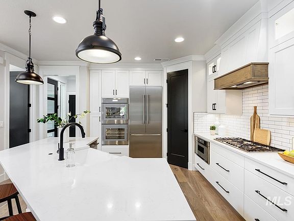 Located in the Lofts at Lakemoor, this stunning Todd Campbell townhome offers the perfect combination of luxury, convenience, and low maintenance living. The community offers a gated entrance, ensuring the safety and privacy of residents. The innovative design and classic finishes create a timeless, elegant feel, while the low maintenance living makes it easy to enjoy all that the community has to offer. Attention to detail is evident throughout the home, with soaring ceilings, custom cabinets, and a chef's kitchen that is perfect for entertaining guests. This ideal floor plan offers a main level master suite, plus two large secondary bedrooms, a loft, a bonus room and a second floor covered balcony. The main level covered patio is perfect for outdoor dining and enjoying the beautiful Idaho weather. The home is adjacent to the community park and pickleball courts. Restaurants, a movie theatre, the Greenbelt, & more are all within walking distance, making this home the perfect blend of convenience and luxury.
