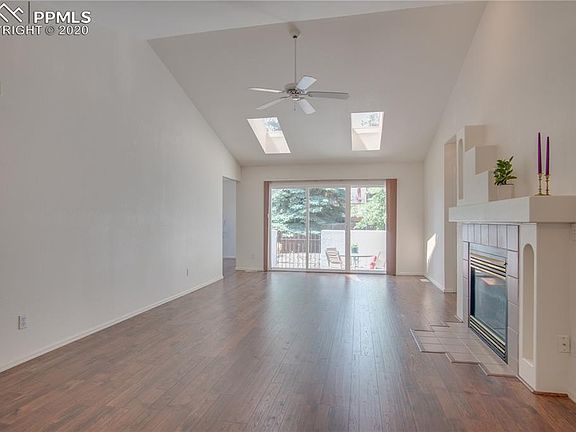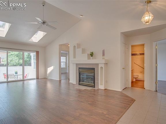 TRUE RANCH style home with no basement and lots of natural light. Excellent Peak and mountain views!! Well maintained, laminate wood floors throughout and 2 private enclosed patios. Gorgeous great room with vaulted ceiling, skylights, gas fireplace and large slider to rear patio. Spacious kitchen offers breakfast/counter bar, eat-in dining area, bay window and wet bar. The 2 bedrooms are conveniently located on opposite sides of the home along with their own bath. Master suite boasts laminate wood floors, adjoining.. 5 piece bath and walk-in closet. Low maintenance living at its finest. Homeowners association maintains the lovely grounds and includes trash and snow removal. Close to parks, schools, shopping and the Woodmen corridor. This floor plan is hard to find and will not last long.
