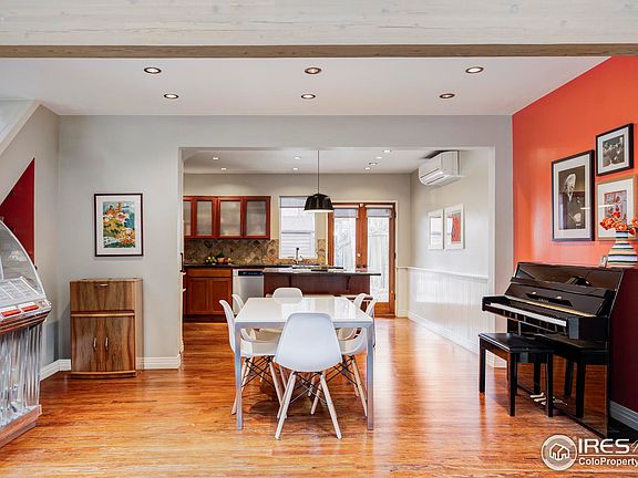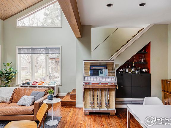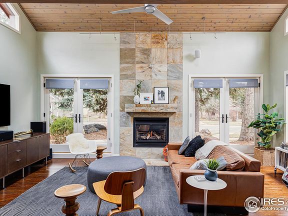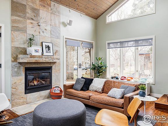This lovely 3-bed, 2-bath home is a turnkey sanctuary featuring a spacious layout highlighted by a main-floor primary suite, spectacular outdoor spaces and an unbeatable location on one of the best blocks in the coveted Newlands neighborhood in Boulder, Colorado. Recently updated, the home impresses with vaulted ceilings and numerous skylights that rise above large windows and hardwood floors throughout. Relax in the inviting living room surrounded by a gas fireplace and whitewashed pine ceilings, while a clerestory window, French doors and skylights flood the space with sunlight and stars. Ahead, the dining room welcomes lively gatherings alongside an open kitchen. Chefs will love the stainless steel appliances, while the center island breakfast bar provides the perfect setting for casual meals.The unique owner's suite delivers a wow factor with glorious outdoor views, another warm fireplace and a generous footprint for a king-size bed and sitting area. A ladder invites you up to a sun-kissed loft, perfect as a peaceful home office. The en suite spa bathroom impresses with a skylit rain shower and a custom double vanity topped with granite. On the upper level, you'll find another full bathroom and two spacious and bright secondary bedrooms: one opens to a private deck, while the other peeks into the living room below. Outside, the magical parcel is a wooded wonderland where stone paths meander through a verdant landscape of towering evergreens, boulders, a lush lawn and a lovely water feature. 2 expansive stone patios set the stage for al fresco dining and lounging, while the fire pit invites you to enjoy s'mores and stargazing. A detached garage with storage completes this special Newlands sanctuary, just one block from North Boulder Park and Rec Center and miles of fantastic trails. Enjoy excellent proximity to both North Boulder and Downtown Boulder amenities, including the nearby Ideal Market.