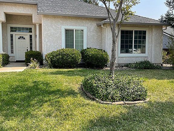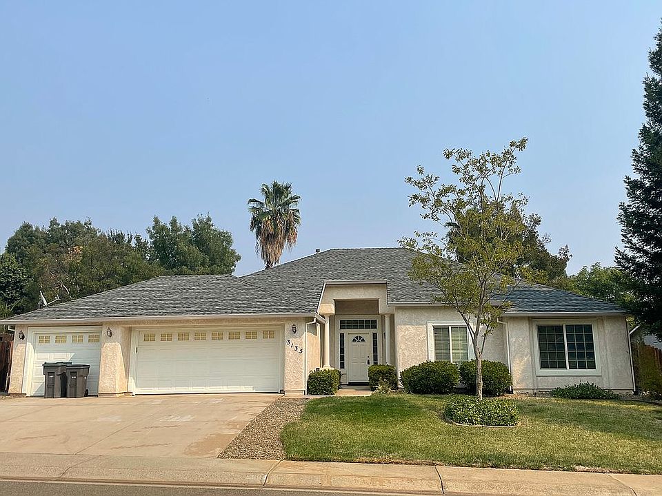3 bedroom 2 bath single family home with 3 car garage. In ground pool with salt water pump and a waterfall feature for a relaxing sound sitting poolside. Low maintenance yard with automated irrigation, beautiful established landscape with stunning palm trees, an umbrella on upper patio, bbq nook, and bamboo shades/ ceiling fan on main patio. 2 bedrooms carpeted, tile throughout the rest of the house. 2 bath, main bath has double sinks. Vaulted living room, dining room, laundry room with utility sink, dryer has both gas and electric connects! House is wired with ADT security system on all windows and exterior doors!