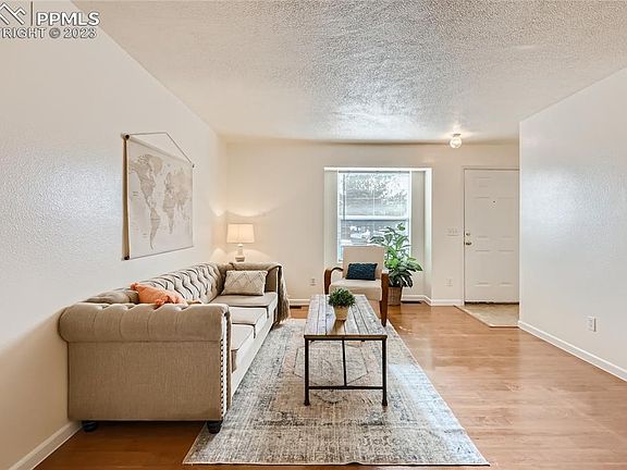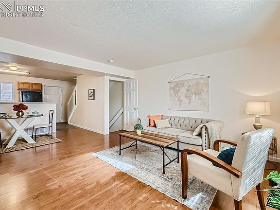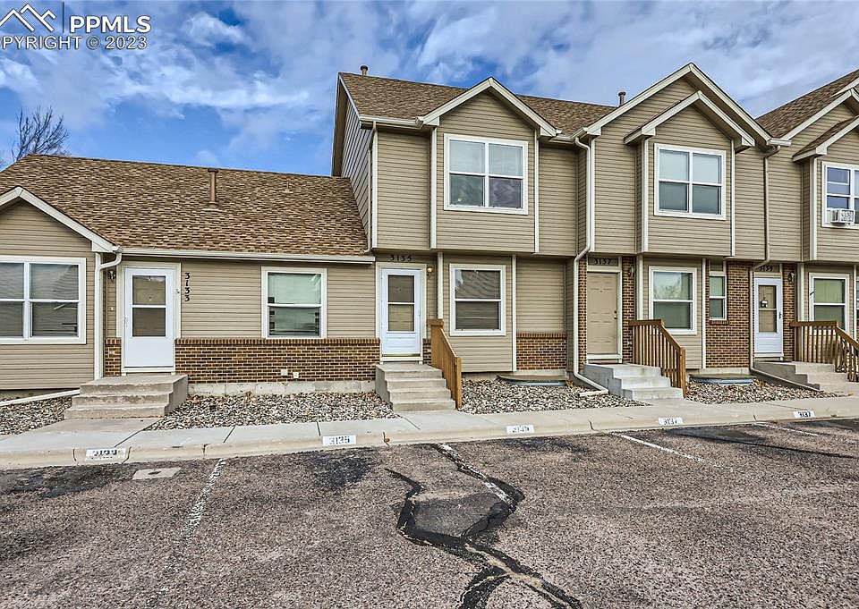 WELCOME HOME, make home ownership not just a dream but a reality with this 3/3 townhome. This two-story townhouse is in a well-maintained homeowners association, and is conveniently located exactly 4.8 miles from both Peterson Air Force Base and Fort Carson Army Base and is two blocks from Soaring Eagles Elementary School. It is a roomy 1,524 square feet with 3 bedrooms and 3 bathrooms and tons of storage. Features include an open living room, dining room and kitchen area on the main level with wood laminate flooring and a half bathroom. The upstairs master bedroom has a warming southwestern exposure with mountain views and updated en suite bathroom. The upper floor is completed with another bedroom and a convenient adjacent laundry area. The basement is finished with a bonus play area, a third bedroom with wood laminate flooring, a three-quarter-sized bathroom, a large linen closet, and a large storage closet. Out the back door on the main level is an enclosed patio area where you will enjoy outdoor relaxing, and step out the back gate to a large community grass lawn. With central air conditioning and the finished basement, you will stay cool in the summer and warm in the winter. High-quality windows, new paint and new carpet really make this home move-in ready with no hidden expenses headed your way. Call for a personal tour and make the dream of owning a home a reality today.