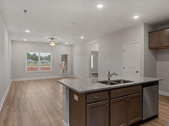END UNIT - FULL BRICK - ONE STORY - “Limited Time up to 5K available with preferred lender” Promotion ends 9-29-2024 3 bedroom 2 bath. Enjoy the charm of one level living with this open concept townhome. From the homes large island overlooking the family room, to the full brick exterior and traditional front entry garage complimenting the rear covered porch and backyard. This home features: 9' ceilings, white cabinets thru out, granite countertops in kitchen and baths, gutters and downspouts, LVP flooring in the main areas and all bedrooms, 5' fiberglass shower with framed door and ceiling fan in the family room. Enjoy life with no grass to mow or termites to treat.