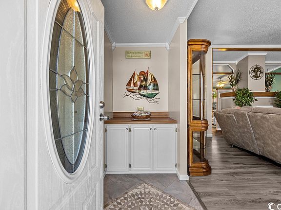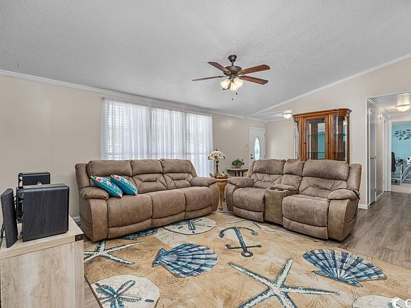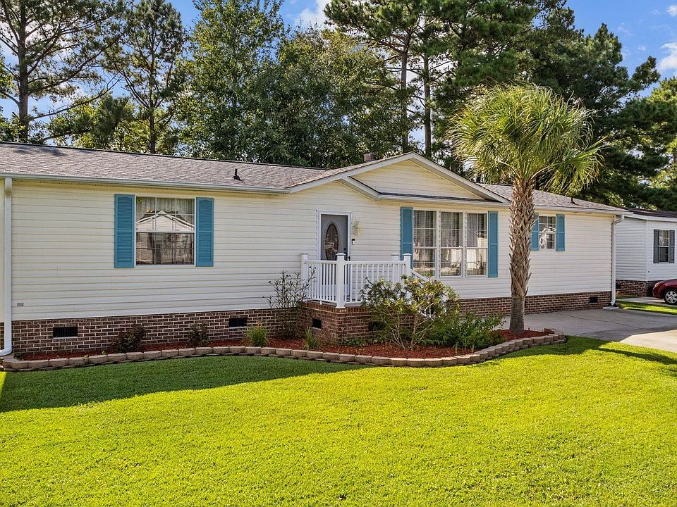 This charming 3BR-2BA home boasts great curb appeal and a backyard oasis in the North Pointe neighborhood. It's move-in ready and impeccably maintained. As you step inside, you'll be greeted by a spacious family room featuring a cozy fireplace, a vaulted ceiling, and a ceiling fan, creating a welcoming atmosphere for gatherings. The kitchen is a focal point with a dining area, granite countertops, a functional work island, and ample cabinetry to fulfill all your storage needs. Throughout the home, you'll notice the crown molding in the living room, kitchen/dining area, and master bedroom, adding an extra touch. Vinyl flooring runs through these areas, including the bathrooms. Both bathrooms have been thoughtfully upgraded with new vanities, lights, and fixtures. The glass sliders off the dining room lead to a backyard haven that's perfect for outdoor living. The outdoor space includes a paver patio with an awning, a wooden deck area for gatherings, a detached shed for yard equipment storage, the yard has plenty of storage space for your water toys and a fully fenced yard that ensures privacy. The lot backs up to a wooded area, providing shade and a peaceful backdrop. The meticulously maintained gardens complete this outdoor oasis. The location of North Pointe is highly convenient, as it's just 2 minutes from Sea Mountain Hwy. This route leads you to the beautiful Cherry Grove beach, Cherry Grove Marina for Intracoastal Waterway activities. You'll also find a variety of restaurants and plenty of shopping options. As an extra perk, North Pointe offers amenities like an outdoor swimming pool, adding to the appeal of this neighborhood.