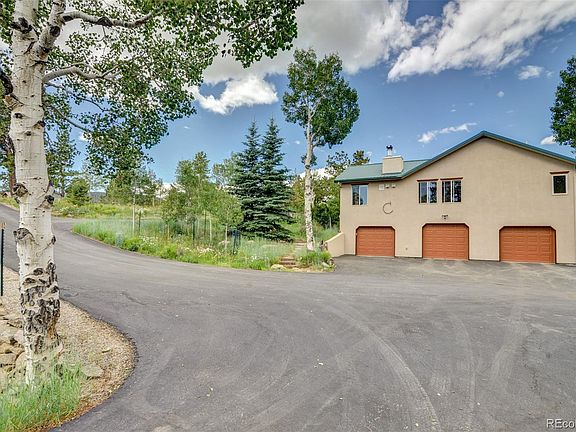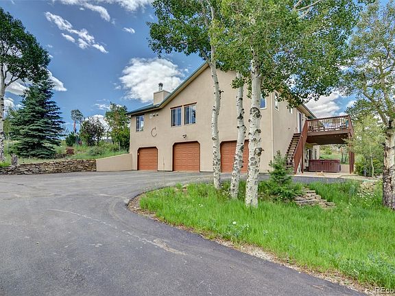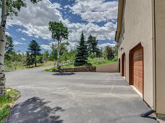This spacious home gives you beautiful mountain views and an open concept design for large family gatherings. The south facing courtyard, large porch and rear deck offer multiple entertaining options. It is close to ski areas, national forest lands, fishing, hiking and ATV trails. The low maintenance exterior and paved driveway leave you time to enjoy this lovely treed, landscaped property and it's wildlife. You will take notice of the hickory custom cabinets, engineered wood floors and quartz counters remodeled in 2018, kitchen island, and (2) cozy fireplaces in the living room and family room. The huge 3 car garage measures over 20X44 and has an amazing built in work bench for all your hobbies and projects. There is a comfortable hot tub with walk out basement access overlooking the pristine fire mitigated property. The covered front porch in the courtyard is the perfect place to watch the hummingbirds and drink your morning coffee. If you are looking for a spectacular mountain home with many custom amenities, this home has everything you are looking for. HOA includes central trash service, dog park, pavilion, and a stocked fishing reservoir for all property owners and guests. Colorado Springs and Denver are a short drive away. Come check out this special home!