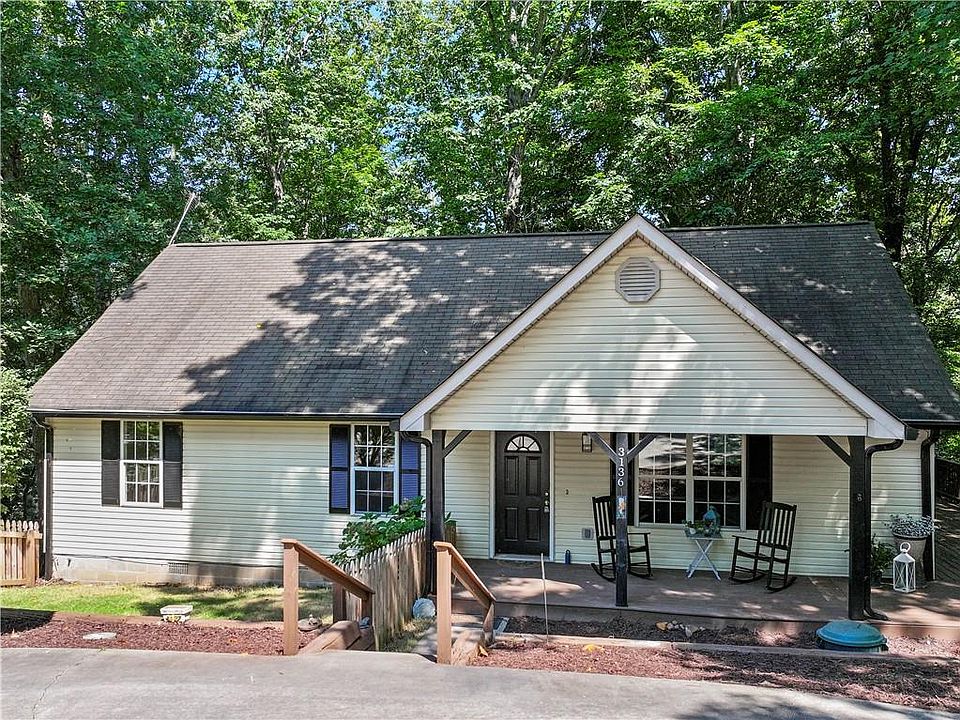 Renovated one level cottage in Lake Lanier neighborhood. You don't need to do a thing. It is perfect. ALL NEW beautiful Laminate wood flooring throughout, totally new kitchen with quartz countertops and matching backsplash with stainless steel appliances, soft close hinges and modern style, single basin sink with goose neck commercial grade faucet, Huge laundry off kitchen with pantry shelf. NEW modern lighting throughout with ceiling fans in each bedroom and great room. Oversized master with double vanity and walk in closet. New vanity in guest bath and rain style faucets. New electrical outlets throughout. Freshly painted interior and stained deck. Full exterior walk in entry basement with dirt floor and moisture barrier is a great area for a work shop and plenty of storage. Attic has flooring for extra storage. No HOA. There is an optional $70 annual fee if you would like to use the boat ramp with dock on beautiful Lake Lanier.