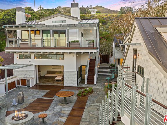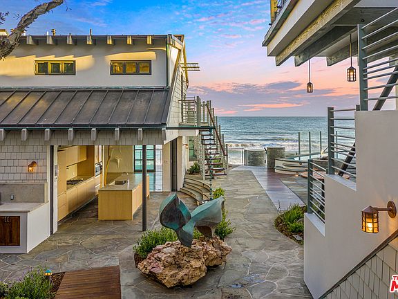 Set upon a coveted half acre lot with 80 feet of beach frontage on Malibu's Broad Beach, this innovative architectural compound from architect Chris Sorensen redefines quintessential California living. Designed to optimize an indoor/outdoor lifestyle, the newly updated 5-bedroom home features 3 structures that flow seamlessly to a central, multi-level terrace with lush landscaping, outdoor kitchen, built-in BBQ, fire pit, pool, jacuzzi and direct access to the beach. The prized offering includes a two-level fitness and relaxation hideaway; a retreat of its own with a deluxe ocean view master and great room; and third structure with additional bedrooms, state-of-the-art kitchen, living area and dining room, all embraced by glass doors that open to the beachfront terrace. Appointed with high-end details throughout, from oak and stone floors to parking for 10 cars and ocean views from every room, this Malibu compound provides the ultimate seaside setting to live, relax and entertain.