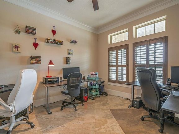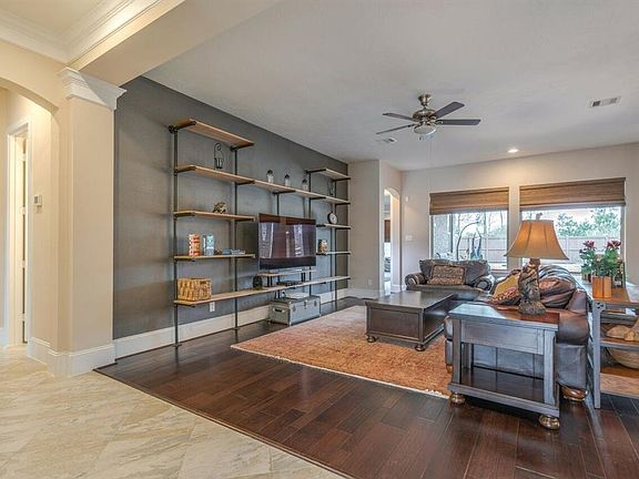 Wonderful single-story Weekley home on a 16,515 Square Foot cul-de-sac lot! Sellers had rich wood flooring installed in the hallway, living room, and breakfast room. A huge kitchen island gives you great prep space and a breakfast bar. You'll love the double ovens and the single basin apron sink. The open plan of the living room to kitchen to dining area makes for a great flow for entertaining family and friends. Windows to the spacious back yard afford a relaxing view. A deep covered patio will enhance your outdoor enjoyment. The study in the front of the house offers a quiet work space environment. The front bedroom is like another master suite. The other secondary bedroom has access to its own full bathroom. You will use every square foot of this spacious one-story. A lot to love!