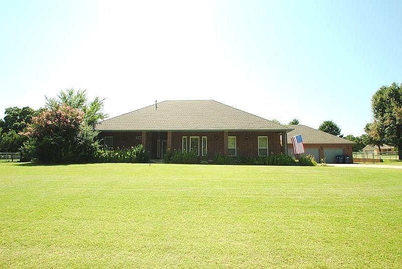 Remarkably maintained 3 bedroom, 2.5 bath, oversized 3 car garage (about 1000ft2), with 2 dining areas, 2 living areas, and huge kitchen. Sits on 2 lots in totaling .8 acres w large inground swimming pool and storm shelter. Enjoy the scenic view from your long covered from porch. Boast a split bedroom plan with a large master bath and closet. Tons of storage in this country home. Close to Tinker