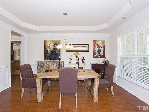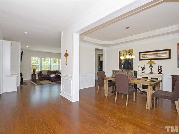 The perfect floor plan in this rare-find Carlton model in Oaks of Highcroft. West Cary premium lot overlooking woods. BRAND NEW hardwood floors, 5 bdr/4 bth w/ first floor bedroom w/double closets & full bath, tons of storage, gourmet kitchen w/granite ctops & SS appls opens to cozy fmly rm w/fireplace & built-ins. Beautiful sunroom leading to huge patio perfect for entertaining & steps to trails! Elegant entry & dining w/crown molding & wainscoting. Pool community, don't miss this one!