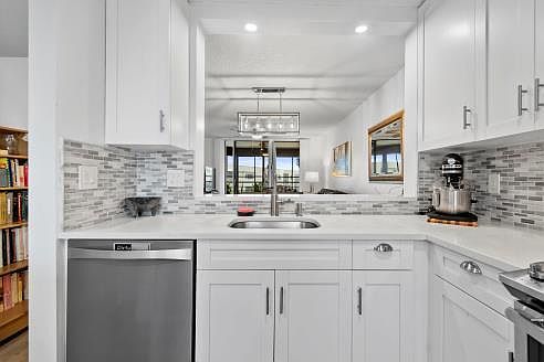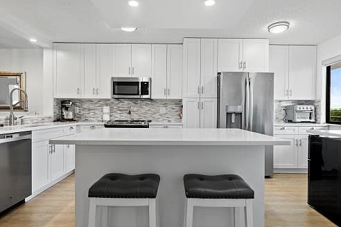 Totally upgraded 2 bedroom 2 bathroom unit in 55+ community. Condo features shiplap entry, waterproof vinyl floors, designer lighting, screened balcony. Storage and sliding Hurricane windows. New a/c, water heater, plus all-appliance warranty through June, 2025. New bathrooms. Deep tub. Chef's kitchen features stainless steel appliances, range with pot-filler above, coffee station, side-by-side refrigerator with door dispenser and large island with storage below. All surfaces feature quartz. View of the pond and one of the two community pools. Clubhouse for entertaining, library, card and pool rooms, sauna adjacent to the 2nd, large swimming pool. Close to all amenities including restaurants, markets, doctors and Okeeheelee Park. Proof of funds and mortgage approval to accompany offers.
