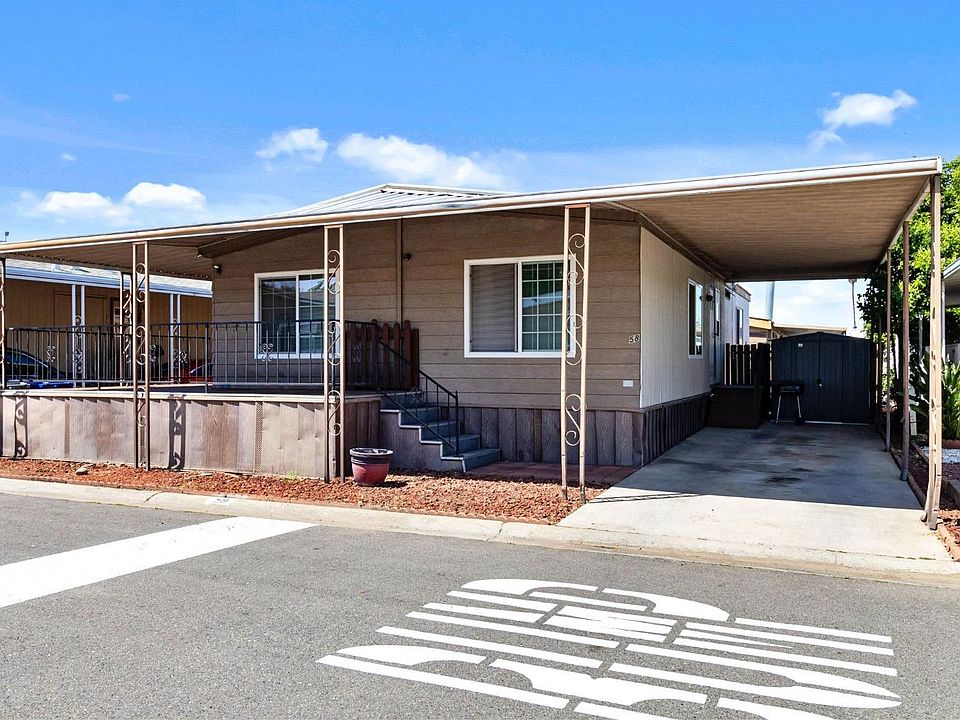 Check out this 2-bedroom, 2-bath manufactured home located in the ALL-AGES Four Seasons gated community. This home features a bright & airy living area with lots of windows and an open dining area with built-in china cabinets, making entertaining a breeze.The kitchen is well-equipped with plenty of cabinets, a 5-burner gas stove, separate pantry and breakfast bar seating, perfect for the family chef. Both bedrooms are spacious with a wall of closets & neutral colors so, move-in ready. The main bedroom has an en-suite bath with a shower/tub combo and dual sinks, 2nd bath has stand up shower with bench. Don't miss the central A/C and heat & separate laundry room with plenty of space to store additional items.Outdoors you'll appreciate a wrap-around patio deck, that's perfect for relaxing, a covered 2 car tandem carport and a private fenced yard with a fruitful orange tree and room for BBQ or garden.Wait, there's more! Upgrades include dual pane windows (most), newer laminate floors, security screen doors (front & back), newer Fence, Ring camera surveillance, a newer water heater and a storage shed.As a resident of Four Seasons, you'll have access to a variety of community amenities, including a huge swimming pool, billiard room, clubhouse/library room, laundry facilities, fitness center, basketball court, picnic areas, playground, and RV storage. All this located near shopping, dining, bus lines and HWY 99 for convenience & quick commutes. Don't miss this opportunity!
