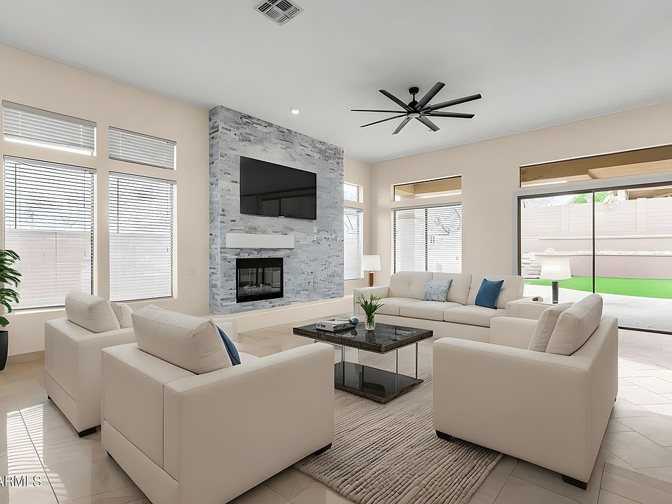 Freshly Painted with a Luxury Lifestyle! This corner lot home in Anthem Golf & Country Club features a fresh interior paint (Dec 2025), high ceilings, natural light & floor-to-ceiling stone tile fireplace in the living area. The kitchen offers white cabinetry, stainless steel appliances including a separate gas cooktop, breakfast bar seating & eat-in area. The bedrooms have plush carpeting & high ceilings with fans; the primary suite includes a luxurious ensuite with oversized double vanity, soaking tub, glass-enclosed shower & walk-in closet. The backyard offers synthetic grass, a large covered patio & raised patio for entertaining, while the garage offers its own A/C unit & epoxy flooring. Enjoy a guarded entry gate, golf course, pools & spa, clubhouse, tennis/pickleball courts & more, with quick access to I-17, shopping, dining & recreation. With an accepted offer, seller agrees to purchase & install two new air conditioning units prior to closing.