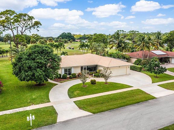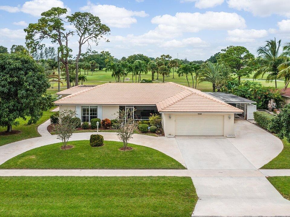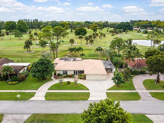 This incredible home is located within a prestigious community on Palm Beach National Golf Course with no homeowner's association fee or golf membership required! Offering nearly 4,000 square feet, enjoy a fabulous four bedroom, three bath floor plan promoting wonderful ease of living, relaxing, and entertaining, while maximizing scenic golf course and water views. Outside, the perfectly manicured yard boasts lush landscaping with ambient lighting and mature mango and avocado trees. Inside, superior finishes and luxurious details such as plantation shutters, upgraded crown molding and trim, stylish French doors, and shining hardwood floors add elegance and charm throughout. Completely remodeled, the true gourmet (See Supplement) kitchen leaves nothing to be desired. The gorgeous, Thomasville solid wood cabinetry showcases soft close cabinets and drawers, roll out features include a spice rack and lazy Susan, plus lovely undercabinet lighting. These are perfectly paired with the sparkling granite countertops and windowsill, tile backsplash, stainless steel appliances, stainless double sink and built-in pantry. Entertain with ease! Set out appetizers on the kitchen island with tons of storage and added eat-in seating. Beyond, three separate living areas and two screened in porches (one in front, with upgraded travertine tile, and one back by the pool) are perfect for hosting guests or simply unwinding. Sleep soundly in the spacious master bedroom with custom closet built-in's and stylish ensuite bath with marble topped, solid wood vanity, and chic tiled shower with dual heads and recessed LED lighting. Each of the secondary bedrooms are spacious and comfortable. There are two additional bathrooms?one is equipped similarly to the master, the other is part of the Jack-and-Jill bedroom configuration and includes an upgraded vanity, dual sinks, linen closet and upgraded tub/shower enclosure with recessed lighting. Out back, your serene tropical paradise awaits! Host a cookout and grill out from the wonderful built-in brick summer kitchen, take a dip in the large pool with brand new heater, or lounge in the sun?all while surrounded by gorgeous landscaping and fairway views. There is plenty of parking in the oversized circular driveway and in the oversized two car garage. An attached covered carport also boasts tons of extra storage space. The garage includes built-in cabinets, sink, refrigerator and new electrical breaker box. This home is completely hurricane ready with hurricane shutters (panels and folding) and generator plug ready to go. The AC system was recently serviced, and the full system including the ductwork was replaced in 2016. Newer Rheem hot water heater installed in 2016, and the septic system was recently pumped. Security cameras are included. This gem truly has it all. Schedule your showing today to secure your piece of paradise!