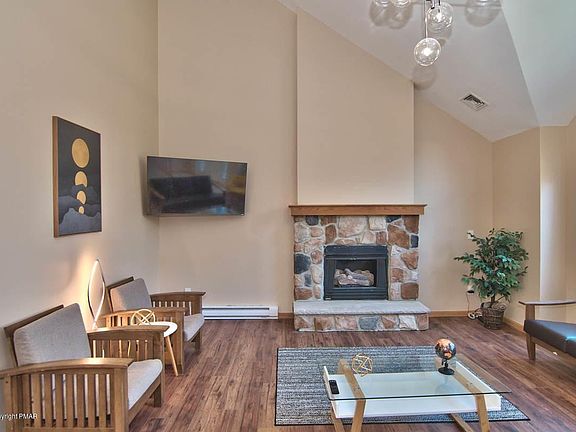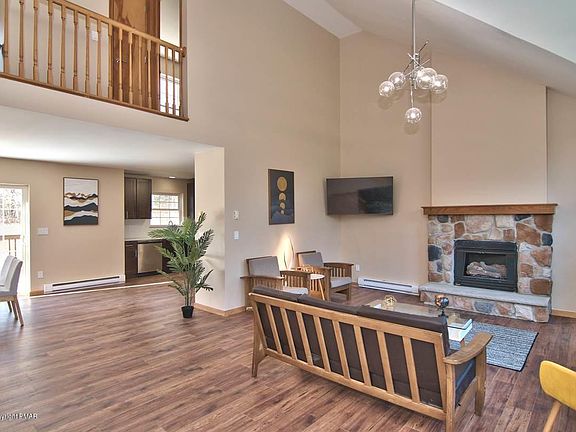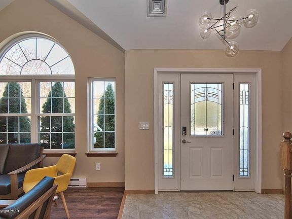 WOW! This Contemporary home has it all! 4 bedroom, 3 full baths on .80 acres with large flat and private yard. Modern kitchen with new shaker cabinets, white quartz countertop with sparkle, subway tile with movement and Stainless steel appliances. Convenient one car garage off kitchen. Living room boasts Cathedral Ceiling and wood burning fireplace. Entire house has been renovated, All new Luxury Vinyl flooring and New Paint through out. Baths have porcelain tile floors and tub/shower area. showers have pebble floors, new toilets, vanities and touch light mirrors. Plus Two Master Suites 2nd FL. All in development with low HOA fees. Great Location near, Shopping, Casino, Kalahari Water Park, Camel Back Ski resort, Hiking, Biking and state game lands. Conveniently located off Routes 380&611