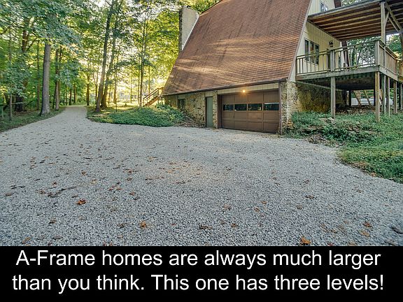 It does not matter if you are looking for a full time resident or if you are looking for a cozy retreat, this house can be your home. You will fall in love with this amazing property as soon as you pull in the tree covered driveway. This well-built, spacious A-frame is much bigger than you expect. Inside you have a master bedroom on the main, an adorable kitchen and large living room with wood burning stove/fireplace. You have 2 spacious bedrooms upstairs with a walk-out deck off of one room. Back downstairs you have a finished basement with Family room w/ wet bar, wood pellet stove, which will warm the house, full bath and laundry. You also have a 2-car garage in the basement and a 4-car pole barn out back that has a concrete floor, electric and lots of space for a boat, four wheeler, golf cart, work shop or whatever you want to make it. This is one beautiful park like setting with mature trees located just minutes from shopping, restaurants, and the entertainment of Bloomington, yet nestled on a private and secluded piece of property.