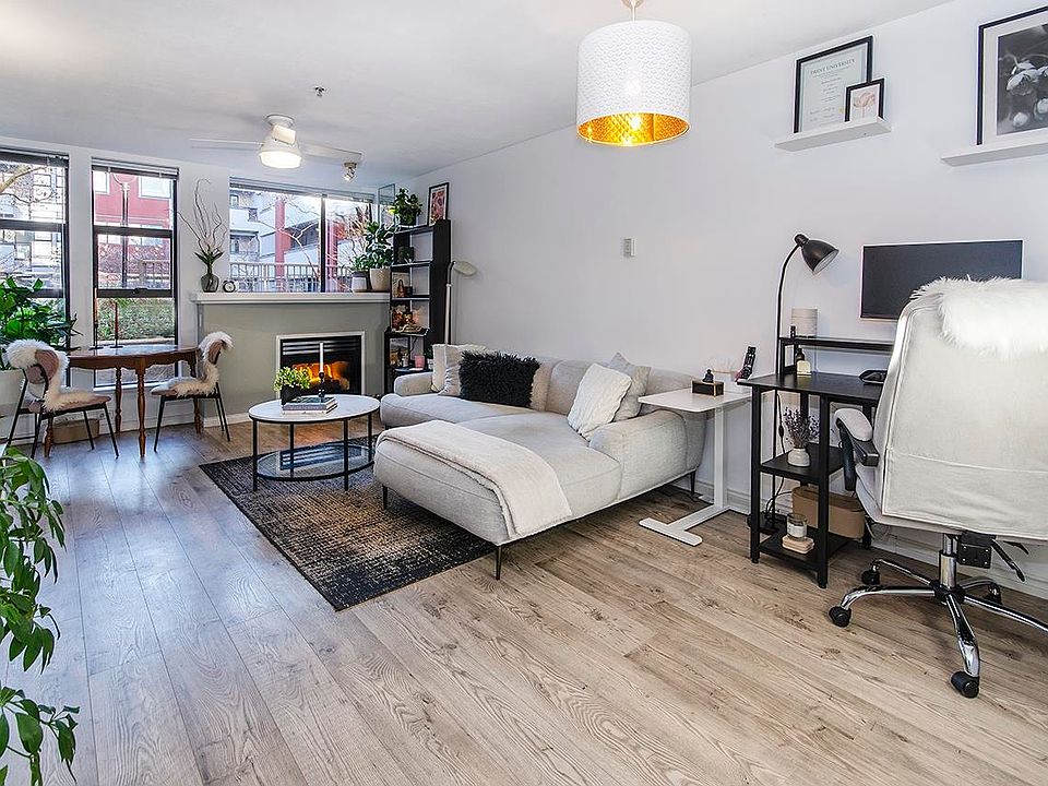 A unique, south facing, ground floor unit overlooking the lush courtyard means no elevator needed! Secure & incredibly quiet. A pleasant open plan, fresh paint thru/out, new flooring, granite countertops & SS appliances. The stylish updates, attractive gas F/P & beautiful natural light create a warm & inviting home w flow out to a spacious, private patio. Immac maintained, w generous kitchen, walk thru closet, in suite laundry & a lg bedrm that can comfortably accommodate a king bed plus work station. Walk to Victoria Park, Lonsdale shops, eateries, amenities, seabus. Building is fully rainscreened, replumbed, exterior recently painted, on site caretaker. Extremely well managed, TWO parking stalls, storage locker & pets welcome. A bright, peaceful, chic, happy home!