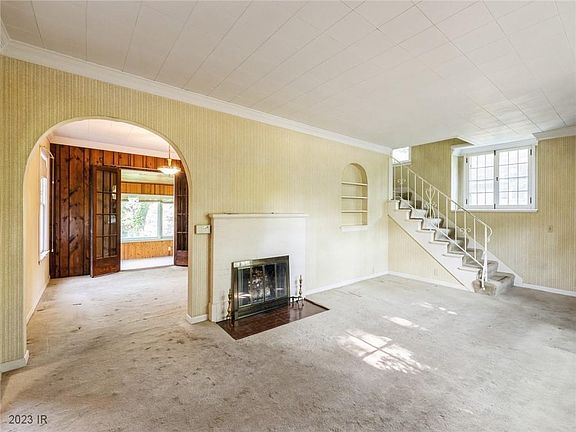 An adjoining dining room has an Art Deco light and is open to a three-season porch. The kitchen is off the dining room and has a cozy dining alcove. There is a new ceiling in the kitchen and bath after the plumbing was replaced with Pex in the upstairs bathroom. A quaint stairwell has an added boxed-out window that lets in lots of light. Upstairs are three bedrooms with great closets and natural light. The paneled basement area has a toilet room and separate laundry area.