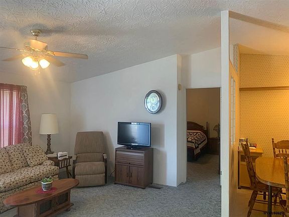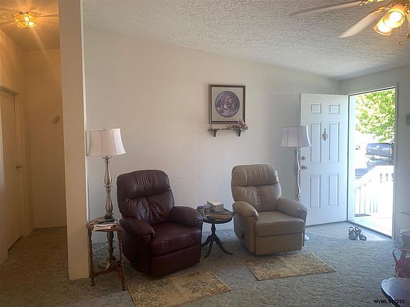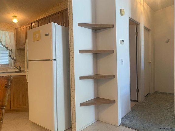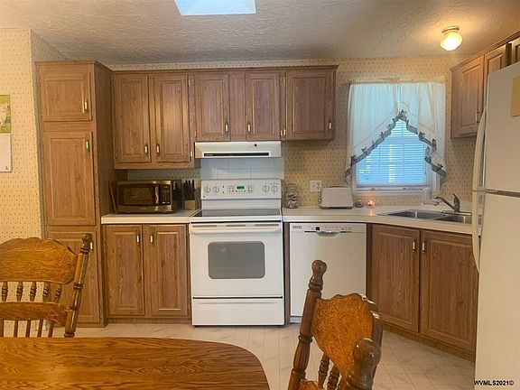 Clean, well-kept in all ages park. Be welcomed by deep carport, and 2 covered entrances. 3 nice sized bedrooms. Main suite sits in back of home for privacy & overlooks private, pretty backyard. Kitchen skylight adds to the great natural light coming in throughout. Utility room with indoor laundry, washer & dryer, plus all appliances included. Great sized shed for extra storage! Home sits on a low-traffic cul-de-sac street! Park rent $625/mo. Some furniture included!