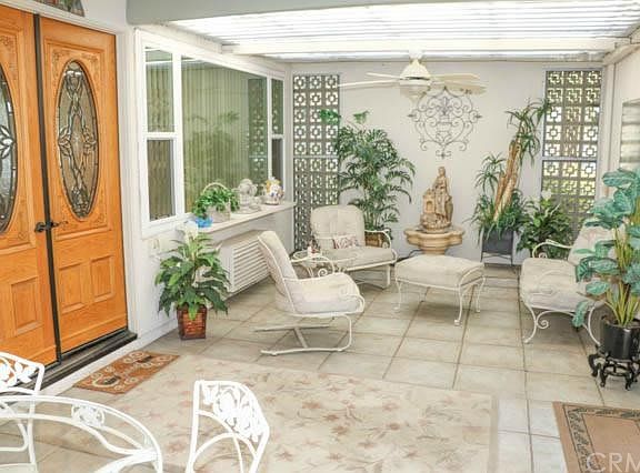 Provided by Jennifer Heflin, Heflin Realty, Inc. Contact Jennifer at (949) 466-8279 for a private showing. WONDERFUL single story end unit "Cordoba"!! FABULOUS LOCATION! Easy parking... park in front and walk right in! Lovely lush green shrubbery approach with a nice walkway. Large gated front patio to enjoy and great for entertaining! Beautiful custom double wood front door entrance. Built-in cabinets in living room which opens into the enclosed Atrium... Would be ideal for a TV room, office, den or anything room : ) This particular Cordoba has a lot of natural light, along with many skylights throughout. Nicely updated kitchen with a window over the sink. Baths have been remodeled with ceramic tiled floors. Newer double pane windows throughout. Inside washer and dryer. This is a great priced upgraded Cordoba in a convenient central location! Laguna Woods Village is a hidden secret...Country Club living with over 200 clubs, 7 clubhouses, 27 hole golf course, equestrian center and much, much more! Approx. 6 miles to Laguna Beach!