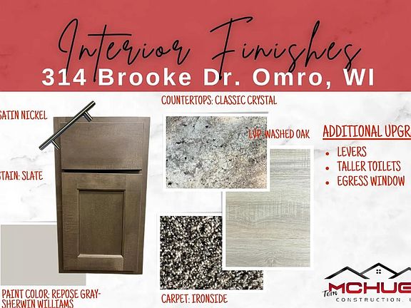 Welcome home from Tom McHugh Construction. The 1343-CE floor plan is offers a 3 bed, 2 bath, 2 car garage. Upgrades include Taller toilets and egress window in basement. Standard inclusions include- Pella windows, Insulated garage doors with windows, Fiberglass exterior doors, Garage service door, Maple cabinets with soft close doors and drawers, Poplar interior trim and solid doors, AC. Home will be completed January 15, 2026. Front picture is computer generated.