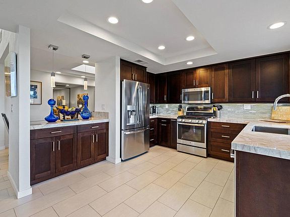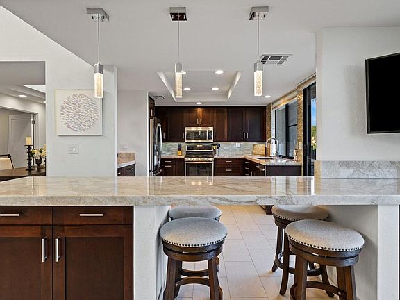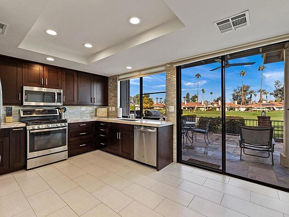 Fabulous fairway, water and mountain VIEWS from the extended patio of this REMODELED, move in ready, 3BD/2BA 300 Max Plan. Open floorplan with professional, contemporary finishes. Recessed LED lighting, designer paint, tile & carpet, custom window coverings, and ceiling fans throughout. Beautiful kitchen remodel features custom cabinetry with soft close drawers and undercabinet lighting, quartzite counters, tile backsplash & accents, added counter space, and stainless GE appliances with gas cooktop. Kitchen wall has been removed and atrium has been converted, creating a seamless flow from the kitchen to living areas. Wonderful cabinetry, tile, lighting & hardware in remodeled baths too. Large 2-car garage with additional storage. Professionally landscaped courtyard and custom entry door will welcome your guests. A/C installed Sept 2016, water heater installed Jan 2021. Just steps to a fantastic community pool & spa. Offered designer furnished per inventory list.
