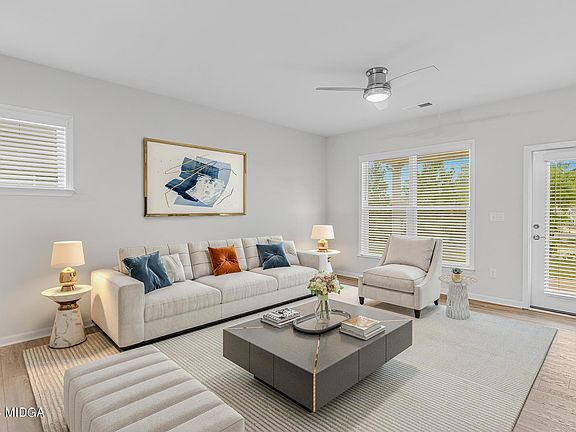 Welcome to this stunning 2 bed / 2 bath ranch-style home nestled in the prestigious 55+ community of Sun City, where resort-style living meets serene retirement. Built in 2021, this meticulously crafted residence offers the perfect blend of modern luxury and comfort. Step inside to discover an inviting open floor plan adorned with updated hardwood flooring and custom blinds. The kitchen features updated cabinetry, a large island with breakfast bar, stainless steel appliances including a Maytag refrigerator, and elegant Moen faucets. Attached to the kitchen is a great flex space that can be used as an office or reading nook. Connected seamlessly to the kitchen is the spacious living room, illuminated by natural light and adorned with remote control Hampton ceiling fans, creating a welcoming space for relaxation and entertainment. Retreat to the tranquil primary suite boasting an en suite bathroom with double vanities, a luxurious shower with seat, and a sprawling walk-in closet. An additional well-appointed bedroom and full bath provide ample accommodations for guests. Convenience meets functionality with a dedicated mudroom and a full laundry room equipped with a Whirlpool washer and dryer, making daily tasks a breeze. Step outside to enjoy the picturesque views from the large covered back patio or relax on the inviting covered front porch. A professionally landscaped yard with a sprinkler system adds to the allure of outdoor living. Completing this exceptional home is an attached garage providing parking and additional storage space for your convenience. Indulge in the unparalleled amenities of the Sun City Peachtree community, including, but not limited to, a private golf course, indoor and outdoor pools, clubhouse, theater, tennis courts, pickleball courts, bocce ball courts, softball fields, and scenic walking trails, ensuring a lifestyle of leisure and enjoyment for residents. Experience the epitome of upscale retirement living in this impeccable home in Sun City. Schedule your private showing today and embrace a lifestyle of luxury, comfort, and relaxation. Check out this video to see all that Sun City Peachtree has to offer! https://youtu.be/1gnbDaB8X_0?si=Z11GserVCxbZJ15C