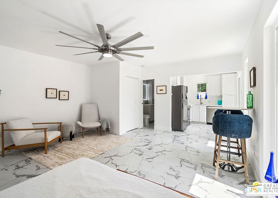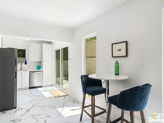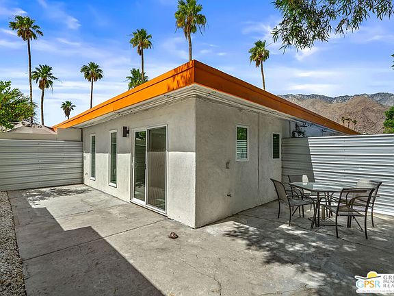 Lantana Lodge is a unique poolside complex close to town and amenities. This studio condo features a private oversize wrap-around patio, giving you a lot of extra room for bonus living, dining and relaxation space. The prime location is a walkers paradise- 3-5 blocks to several popular restaurants, The Riviera and Arrive Hotels, Desert Regional Hospital and Uptown Shopping and Dining. Stroll Vista Las Palmas, the Movie Colony and Racquet Club East neighborhoods, each full of character and history. These units are popular monthly rentals (30 days or more), Weekend getaways for frequent visitors, or as minimalists' forever home. Fully renovated in 2023/2024 and lightly used. Offering high quality windows and doors, smooth wall texture, new kitchen cabinets and exhaust fan, new appliances , mini-split AC, and an amazing Fanimation ceiling fan. Bathroom upgrades include a striking large tiled shower, LED lighted mirror, new vanity and toilet, automated lighting & exhaust fans. The attached private patio is larger than the unit itself and offers ample space for multiple seating areas and leisure/storage options. The pool has the iconic Central Palm Springs mountain views you're looking for and plenty of room to swim and splash. Homeowners dues include electricity, trash, water and natural gas, exterior and common area maintenance. Reserved parking space included.