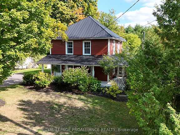 Nestled in the drumlins North of Belleville, just 35 minutes from PEC, lies Halloway, a hamlet steeped in history and rural charm. Once a bustling stop along the Grand Junction Railroad, it was home to general stores, mills, and artisans. Today, that same sense of heritage endures in the character homes that dot the landscape. Here, the land rises and falls with striking elevation, offering dramatic views and a rare sense of seclusion so close to the city. Set on more than 2 acres of this countryside is a circa 1920 farmhouse, a timeless two-story that radiates warmth. A welcoming wrap-around porch invites you to pause and take in the views, while a gentle creek winds through the property, joined by a tranquil pond. At the rear, a tucked-away fire pit creates the perfect spot for campouts or evenings beneath the stars. Inside, rustic details pair beautifully with modern touches. Exposed beams, stone accents, and wood plank flooring bring charm throughout. The open-concept main floor flows easily from living and dining into a generous kitchen with a massive island, vaulted ceilings, and a cozy wood-burning stove. Step out to the multi-level patio - an entertainers dream with built-in BBQ, perennial gardens, and even a playful tee box for practicing your short game. The main floor also offers a den or office connected to a spa-inspired bath with Jacuzzi tub, glass-and-tile shower, and heated floors. Upstairs, three bright bedrooms continue the inviting feel, with the primary enjoying semi-ensuite access. A 40' x 26' heated detached garage with 11' ceilings, loft bar and lounge, its own driveway, and separately metered 200 amp service is ideal for a contractor, hobbyist, or home business, with potential for a secondary dwelling. Just two minutes away, the Trail of Two Lakes links Belleville to Madoc, offering miles of hiking, biking, snowmobiling, and ATV adventures. Recent updates include a new septic system (2020) and a wood stove chimney (2021).