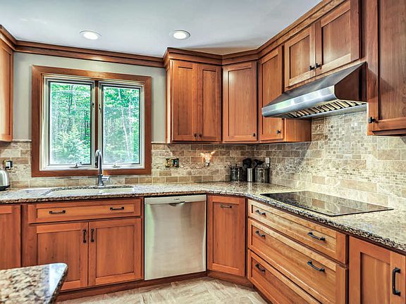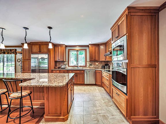 Gorgeous 4 bedroom, 2 1/2 bath Cape on 16+ acres with attached 2 car garage and additional oversized 1 car garage! An outdoor enthusiasts dream! You'll love the stone patios, newly built pergola, Bocce ball court, archery range, pond, fire pit, gardens, walking trails, rock walls, farmers porch, and more! This home also offers a beautiful custom cherry kitchen with quartz counter tops & tiled backsplash, stainless steel appliances and island, wood and tile flooring, sliders to back deck, laundry room, central vac, generator hook up, woodstove, paved driveway with lighting, video surveillance system, and so much more! Perfect in-law set up or office/den above the garage. You've got to see this amazing home!