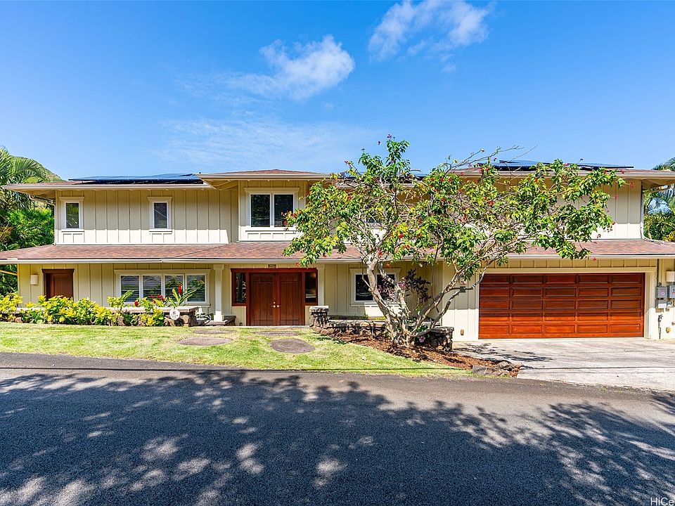Priced below market! Nestled on a hillside cul-de-sac in the quiet end of Lanikai, this move-in ready, architect-designed, custom-built home offers a perfect blend of luxury & tranquility. Built new in 2011, it features seamless indoor/outdoor flow. The gourmet kitchen includes Thermador appliances & abundant custom Pyinkado cabinets. Custom mahogany sliders in the great room open 24' to a spacious covered lanai, creating a treehouse feel w/lush surroundings & gentle tradewinds. Travertine floors run seamlessly from the main level out onto the lanai, while the 2nd level showcases stunning Tigerwood floors. Upstairs features a primary suite w/ensuite bath, large walk-in closet & private lanai w/ocean & Mokulua Island views. A 2nd bedroom on this level w/a full bath can make a perfect office. The lower level, built new in 2020, consists of an expansive L-shaped rec room w/a wet bar, full bath, & a lanai w/steps leading to a terraced backyard filled w/plumeria, citrus, avocado, and banana trees. Eco-friendly features include 44 owned solar panels, an EV plug & a backup battery system. A short walk to Lanikai Beach, this home offers privacy, comfort & an unparalleled lifestyle.