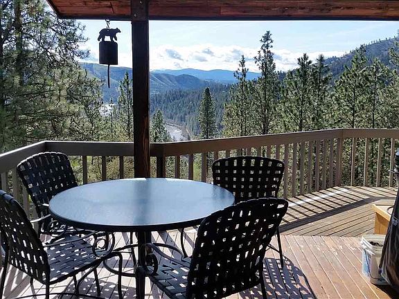 One of a kind! Privacy, view of the river, close to town, acreage, fenced for animals and a fenced garden area with cherries, nectarines and pear, walkout bsmt.,custom cabinets with pullouts, 3 bdrms, 2 1/2 baths, open living room with wood stove, kitchen and dining area with a full wall of windows looking down at the Clearwater River. Walk out basement has 2 bdrms/1bath and an additional family room. Covered deck on the east side, uncovered deck to the south, same river view! Off of the kitchen a large walk in pantry and a laundry room with deep sink, closet and an additional pantry. Lots of storage! Two car garage, large parking area. Beautiful pines contribute to the setting.