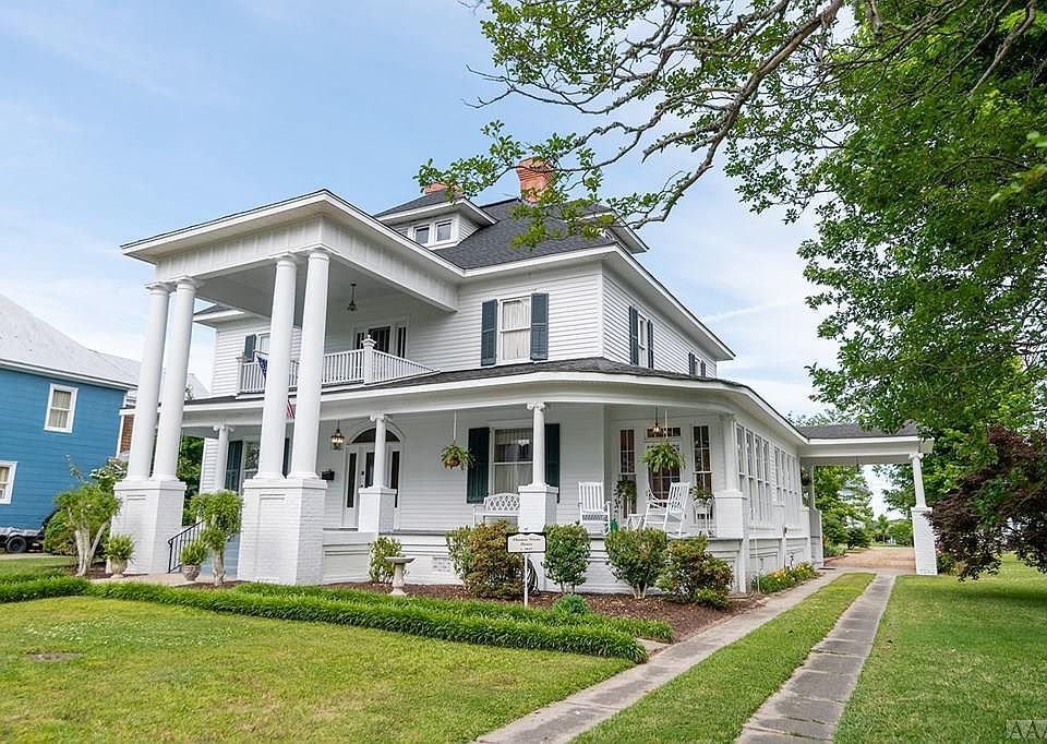 This home is affectionately known as The Grand Dame of Hertford! This Neoclassical Revival Home was built in 1917 for Mr Thomas Nixon a prominent business and civic leader. A Grand Entrance Hall both 1st level and 2nd level create large open spaces to easily move between bedrooms and common areas! 10 Ft Ceilings- Hardwood Floors- Original Windows- Wrap Around Porches- Hipped Dormers and Pillars will make you swoon. This home is on 4 lots between Front and Church St with a Driveway to access both! Just two blocks from the local pub, little shops and eateries in Downtown Walking District.