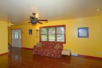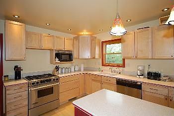 This home has bamboo and cork and wood floors - very unique. Tile in bathrooms. Stain-glass windows in doors. Beautiful birch cabinets, solid surface counters, solid oak doors.