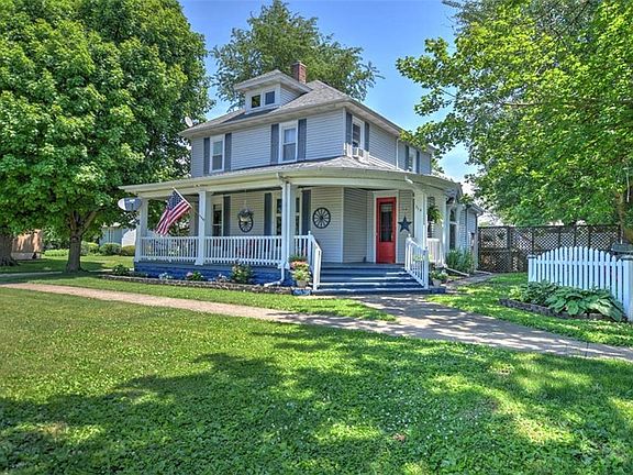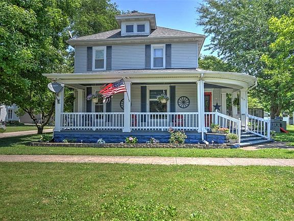 Great two story home in small town schools! You'll love the charm of the wrap around porch and the location of the corner lot across the street from the park. Great space on the inside with separate family room, living room, dining room. Main floor also has an office that could be used as a 4th bedroom. Kitchen has had cabinets refurbished and backsplash added. Beautiful oak woodwork and built-ins. Upstairs has 3 bedrooms and an updated full bathroom including dual sink, heated floors, and jetted tub. Enjoy the privacy in your back yard with deck, above ground pool, fenced yard, and huge fire pit. Plenty of garage space with a 3 car heated garage and separate 2 car garage. Roof new in 2014; Furnace new in 2003; AC and water heater age unknown. Electrical has been updated to 200 amp service. Home has been pre-inspected! Note: 3rd bedroom upstairs does not have closet.